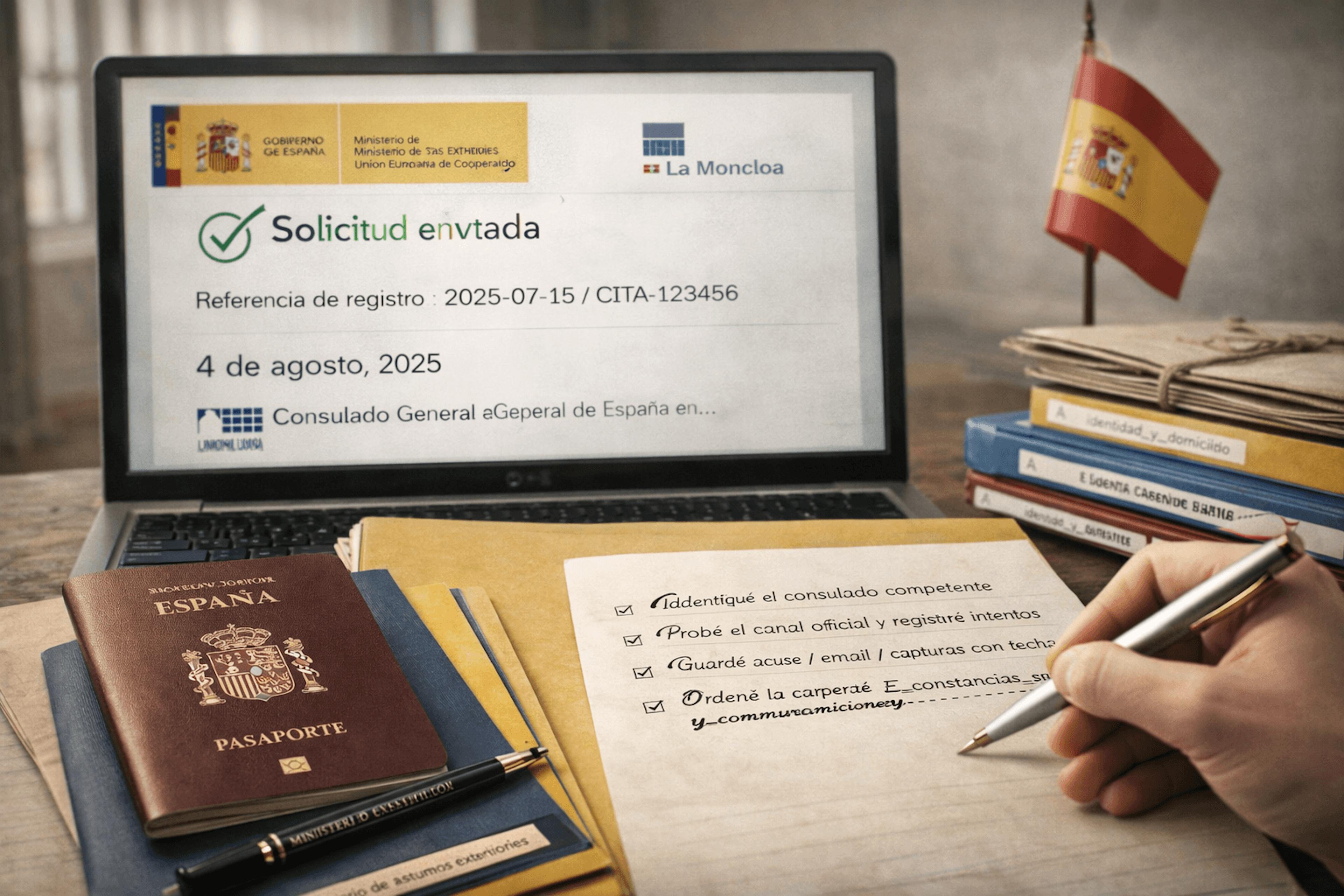 A julio de 2025, el factor limitante para muchas personas no es “calificar”, sino conseguir y sostener el proceso de cita previa. Con la prórroga aprobada en 2024, el plazo para ejercer el derecho se amplía hasta el 22/10/2025, por lo que la prioridad pasa a ser: pedir cita por los canales habilitados, guardar evidencia de la solicitud, y preparar una carpeta consistente para evitar reprogramaciones. Ministry of Foreign Affairs+1